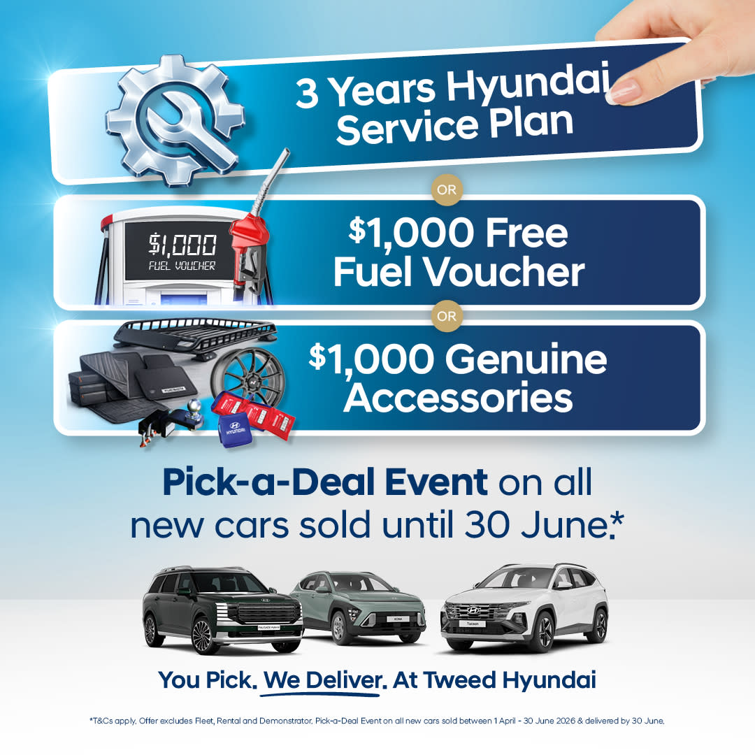 *Terms and conditions apply. All customers who purchase a new Hyundai vehicle between 1 April 2026 and 30 June 2026 and with a vehicle delivery on or prior to 30 June 2026 will be eligible one (1) opportunity per purchased vehicle to select one of the three offered deals. The deal will be issued to the customer on delivery of their vehicle on or prior to 30 June 2026, or if the customer chooses a Voucher, the Voucher will be delivered within one (1) week of vehicle delivery. Excludes government, fleet, demonstrator vehicles, and rental buyers. Deals offered include: 3 years Hyundai Service Plan, $1,000 Fuel Voucher, and $1,000 Voucher for Genuine Hyundai Accessories. Offer is subject to change, cancellation, and not available in conjunction with any other offer or discount.